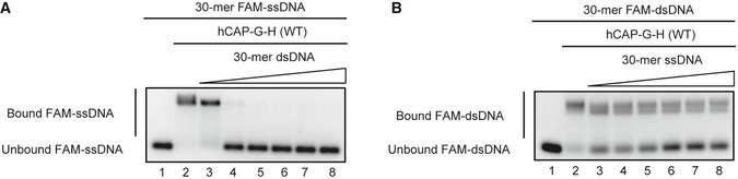 30‐mer FAM‐ssDNA was incubated with no protein (lanes 1), WT hCAP‐G‐H (WT; lanes 2–8), or increasing amounts of 30‐bp dsDNA (WT; lanes 2–8).30‐bp FAM‐dsDNA was incubated with no protein (lanes 1), WT hCAP‐G‐H (WT; lanes 2–8), or increasing amounts of 30‐mer ssDNA (WT; lanes 2–8).