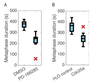 Figure 2. Increasing Cdk1 activity shortens metaphase. (A) Boxplot (median ± quartiles, X indicates outlier) of metaphase duration in DMSO control or PD-166285âtreated cells reveals significant decrease with Wee1 inhibition (P = 0.005, t test, n = 13 control, 7 treated). (B) Boxplot of metaphase duration in cells with or without exogenous Cdc25a demonstrates a significant decrease in metaphase duration with Cdc25a overexpression (P = 0.0008, t test, n = 7 control, 15 cdc25a). |