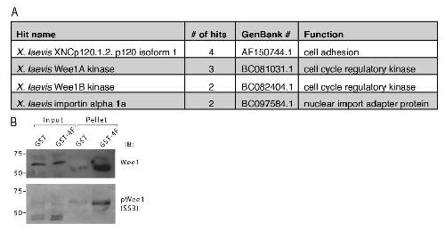 Figure S1. Interaction between X. laevis Myo10 and Wee1. (A) A Y2H using the MyTH4-FERM cassette from the tail of X. laevis Myo10 as bait identified Wee1 as a Myo10 binding partner. All hits identified more than once in the screen are shown. (B) GST-MyTH4-FERM pulls endogenous Wee1 and pWee1 out of extracts. Bacterial recombinant sepharose-bound GST and GST-MyTH4-FERM (GST-4F) were mixed with concentrated extracts from X. laevis embryos. Raw extract (input) and washed pellets were boiled in SDS sample buffer and subjected to immunoblot analysis. Here two identical gels were run and transferred to nitrocellulose and then immunoblotted (IB) with our Wee1 antibody (top) or a commercial antibody directed against Ser53- phosphorylated Wee1 (pWee1 S53). |
