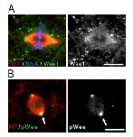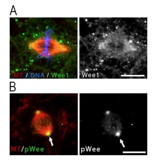 Figure S2. Wee1 localizes to the mitotic spindle. (A) Stage 10 embryos were prepermeabilized before fixation and immunostained with a commercial antibody against α-tubulin (microtubule [MT], red) and our Wee1 antibody (green). DNA is labeled with propidium iodide (blue). Bar, 10 µm. (B) Stage 10 embryos, without prepermeabilization, were immunostained for α-tubulin (MT, red) and with a commercial antibody against Ser53-phosphorylated Wee1 (pWee, green). Arrows indicate pole concentration of pWee. Other commercial antibodies against total Wee1 did not work in frog cells. The pWee antibody was used simply to verify Wee1 localization to the spindle, and we do not speculate on the relation of this phosphorylation to our model. See Watanabe et al. (2005) for a description of Ser53 pWee function. Bar, 10 μm |