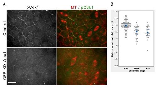 Figure S3. Effects of kinase-dead Wee1 and cell cycle stage on junctional pCdk1 levels. (A) Stage 10 control embryos or those expressing GFP-tagged KD Wee1A were fixed and immunostained for α-tubulin (microtubule [MT], red) and Y15-phosphorylated Cdk1 (pCdk1, green). Images shows loss of junctional pCdk1 signal in KD-Wee1A expressing cells. KD mutant was generated via a K239R substitution (Leise and Mueller, 2002). Bar, 10 μm. (B) Quantification of junctional pCdk1 signal in individual control cells at different cell cycle stages (ana, anaphase; inter, interphase; meta, metaphase). Y-axis represents fold change in junctional pCdk1 relative to mean interphase cell signal in the same image. A gray dot represents a single cell, the blue dot the mean, and the blue bars the 95% confidence interval. Sample size = 61 (interphase), 30 (metaphase), and 21 (anaphase). Only mitotic cells completely surrounded by interphase cells were analyzed. ANOVA and Tukeyâs post-hoc test showed statistically significant decreases in junctional pCdk1 for both mitotic populations compared with interphase cells (P = 0.0001 for both). |