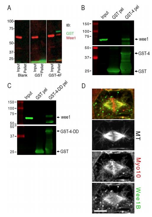 Figure 1. Myo10 directly interacts with Wee1 via the MyTH4 domain. (A) In vitro binding assay between recombinant FLAG-Wee1A and empty glutathione-sepharose beads (blank) or bead-bound GST or GST-MyTH4-FERM (GST-4F). Inputs and washed glutathione pellets were boiled in SDS sample buffer and immunoblotted for GST and Wee1 by standard methods. (B) Bacterial recombinant sepharose-bound GST and GST-MyTH4 (GST-4) were mixed with concentrated extracts from stage 10 X. laevis embryos. Washed pellets (pel) and raw extract (input) were boiled in SDS sample buffer and subjected to immunoblot analysis. Input sample represents 2% of assay input and pellets each represent half of the pulldown product. Membranes were cut at the 50-kD marker and immunoblotted for Wee1 (top) or GST (bottom). The lower GST-reactive = bands in the GST-4 pel sample represent protein degradation products. (C) Same as B, except using recombinant GST-MyTH4-DD (GST-4-DD) protein. Numbers on the left side of the blots in AâC indicate molecular weight in kilodaltons. (D) Stage 10 embryos were prepermeabilized before fixation and immunostained with antibodies against α-tubulin (microtubule [MT] not in merge), Wee1B (green), and Myo10 (red). The Myo10 antibody is conjugated with Alexa Fluor 568 and was applied after the antiârabbit secondary used to label the Wee1B antibody. Bar, 10 µm. |