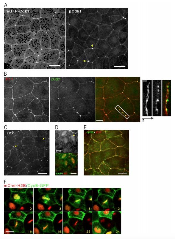 Figure 3. Cdk1 is enriched at cell junctions. (A) Left: Image from a live stage 10 embryo expressing eGFP-Cdk1. Image shown is z-projection of apical region showing the native GFP signal along junctions, particularly tricell junctions. Bar, 20 µm. Right: Stage 10 embryo fixed and immunostained with antibody specific for Y15 phosphorylated Cdk1 (pCdk1). Bar, 20 µm. Arrows show tricell junctions. (B) Left: Stage 10 control embryos immunostained with ZO-1 (red) and Cdk1âphosphorylated tyrosine 15 (green). Bar, 10 µm. Right: A 3D projection of the boxed region, rotated 90 degrees, with the apical surface to the right. Bar, 2.5 µm. (C) Apical projections of stage 10 embryo fixed in methanol/DMSO and immunostained with antibodies for cyclin B. Arrows show tricell junctions. Bar, 20 µm. (D) Midcell projections of stage 10 embryo fixed in formaldehyde and immunostained with antibodies for cyclin B (green) and microtubules (red). Arrowhead shows poleward spindle staining of cyclin B. Bar, 20 µm. (E) Apical projection of stage 10 embryo fixed in methanol/DMSO and immunostained with antibodies for cyclin B (green) and ZO-1 (red). Bar, 20 µm. (F) Series of still images from a movie of stage 10 embryos expressing mCheâ histone H2B (red) and cyclin BâGFP (green). Time stamps indicate minutes after first frame. Bar, 20 µm. See also Video 1. |