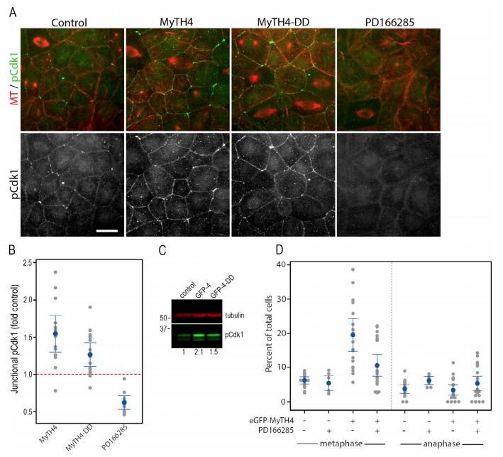 Figure 4. MyTH4 domain expression increases junctional pCdk1 staining. (A) Uninjected control stage 10 embryos, or those expressing eGFP-MyTH4 or eGFP-MyTH4-DD or treated with 25 µM PD166285 for 30 min, were fixed and immunostained with antibodies against α-tubulin (MT, red) and pCdk1 (green). Bar, 20 µm. (B) Quantification of junctional pCdk1 signal in uninjected control embryos, or those expressing MyTH4 or MyTH4-DD or incubated for 30 min in 25 µM PD166285. y axis represents fold change in junctional pCdk1 relative to controls within the same experiment. The red line represents the mean control pCdk1 at junctions, defined as 1. A gray dot represents a single embryo, the blue dot the mean and the blue bars the 95% confidence interval. n = 10â15. All are significantly different from control (from left to right: P = 0.0004; P =0.0001; P =0.003). (C) Embryos were microinjected at the two-cell stage with mRNA encoding either GFP-MyTH4 (GFP-4) or GFP-MyTH4-DD (GFP-4-DD). At stage 10, whole-cell extracts were prepared and immunoblotted for α-tubulin (red) and pCdk1 (green). The numbers at the bottom of the blot indicate relative levels of pCdk1 in this image. Numbers on the left side indicate molecular weight in kilodaltons. (D) Stage 10 control or eGFP-MyTH4-expressing embryos were incubated for 0 or 30 min in 25 µM PD166285. The embryos were then fixed and stained for microtubules (antiâα-tubulin) and DNA (DAPI or TO-PRO3). The percentage of metaphase and anaphase cells were counted for each field of epithelium taken at 40Ã. In the plot, a gray dot represents a single embryo, the blue dot the mean, and the blue bars the 95% confidence interval. n = 10â20 embryos from four different experiments |