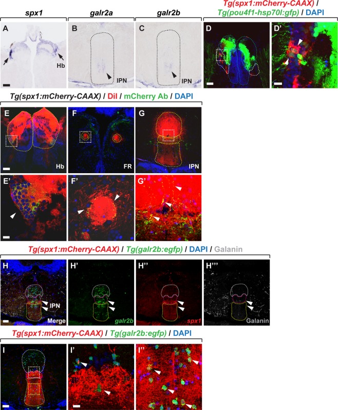 Spexin (SPX) is a highly conserved neuropeptide that is widely expressed in mammalian brain and peripheral tissue. In teleost, SPX1 is mainly expressed in the brain and ovary, and is involved in reproduction and food intake. A second form of SPX, SPX2, was recently identified in chick, Xenopus, and zebrafish. The expression pattern and roles of SPX2 are unknown. SPX (spx1) is highly expressed in the vertebrate brain, but its distribution, circuits, and interactions with its putative receptor are unknown. Here, we observed expression of spx1 in the midbrain and hindbrain, and spx2 in the hypothalamic preoptic area using in situ RNA hybridization in zebrafish. Analysis of transgenic reporter zebrafish revealed that hindbrain SPX1 neurons are PAX2+ inhibitory interneurons and project to the spinal cord, where they interact with galanin receptor 2b (GALR2b) neurons, suggesting that hindbrain SPX1 neurons are reticulospinal neurons. spx1 mRNA and SPX1 reporter expression were observed in dorsal habenula (dHb). SPX1 neurons in the dHb project to the interpeduncular nucleus (IPN), where GALR2a and GALR2b expression was also observed, suggesting that habenula SPX1 neurons may interact with GALR2a/2b in the IPN.