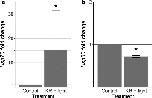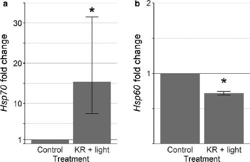 FIGURE 3 Expression of heat shock protein genes is highly modulated early in the damage response. (a) Hsp70 is upregulated 15‐fold in KillerRed and light‐treated hearts over uninjected controls at 3‐hr post‐light exposure (*p < 0.05, Kruskal–Wallis test). Changes in Hsp70 expression were measured relative to Eef1aexpression as an endogenous control. Error bars indicate SEM of dCt values. n = 5–10 tadpoles per replicate, N = 3 replicates. (b) Hsp60 is downregulated in KillerRed and light‐treated hearts to 70% of expression levels in uninjected controls at 3‐hr post‐light exposure (*p < 0.05, Kruskal–Wallis test). Changes in Hsp60expression were measured relative to Eef1a expression as an endogenous control. Error bars indicate SEM of dCt values. n = 5–10 tadpoles per replicate, N = 3 replicates