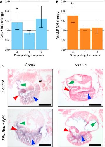 Figure 4. Cardiac progenitor genes are upregulated at 3 days postâlight activation. (a) KillerRedâexpressing tadpole hearts exposed to light show a significant increase in expression of Gata4 relative to uninjected controls at 3âdays postâlight exposure (*p < 0.05; KruskalâWallis test). Changes in Gata4 expression were measured relative to Eef1a expression as an endogenous control. Error bars indicate SEM of dCt values. n = 10 tadpoles per replicate, N = 6 replicates. (b) KillerRedâexpressing tadpole hearts exposed to light show a significant increase in expression of Nkx2.5 relative to uninjected controls at 3 days postâlight exposure (**p < 0.01; KruskalâWallis test). Changes in Nkx2.5 expression were measured relative to Eef1a expression as an endogenous control. Error bars indicate SEM of dCt values. n = 10 tadpoles per replicate, N = 5 replicates. (c) In situ hybridization for Gata4 and Nkx2.5 shows that there is no change in which tissues these genes are expressed in following light activation of KillerRedâexpressing tadpole hearts. Both genes are expressed, among other tissues, in the myocardium of the ventricle (blue arrow), the myocardium of the outflow track (red arrow), and the inner lining (endocardium or apical myocardium) of the atrium (green arrow). Representative images from 3 days postâlight activation are shown here. Scale bar = 100 μm. Section thickness = 10 μm
