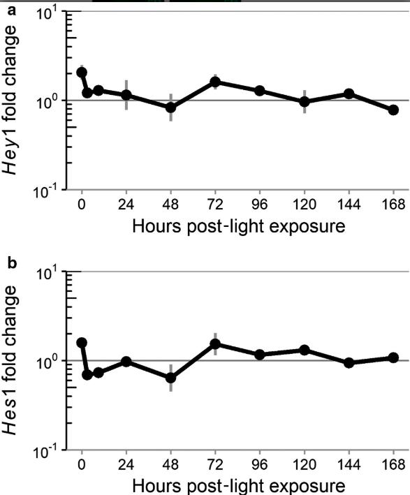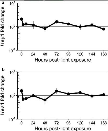 Figure 5. Notch targets are unchanged during the cardiac oxidative stress response. Expression of (a) Hey1 and (b) Hes1, basic helixâloopâhelix (bHLH) proteins downstream of Notch signaling, does not change significantly in KillerRedâexpressing and lightâtreated tadpole hearts relative to uninjected controls over the first week after light activation (p > 0.05, KruskalâWallis test). Gene expression was measured relative to uninjected control hearts, using Eef1a as an endogenous control. Points indicate mean fold change at each time point, and vertical bars indicate range. n = 10 tadpoles per replicate, N = 2 replicates