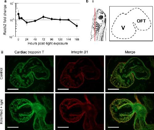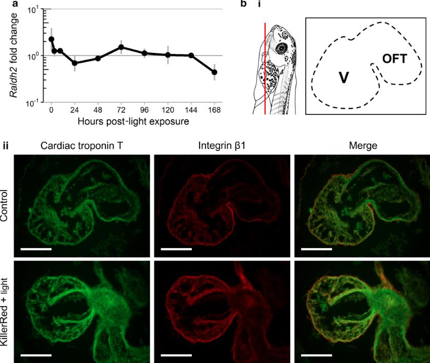 Figure 6. Epicardial activation is not part of the Xenopus laevis oxidative damage response. (a) Retinaldehyde dehydrogenase (Raldh2) expression, a marker of epicardial activation in cardiac regeneration, does not change significantly in KillerRedâexpressing and lightâtreated tadpole hearts relative to uninjected controls over the first week after light activation (p > 0.05, KruskalâWallis test). Raldh2 expression was measured relative to uninjected control hearts, using Eef1a as an endogenous control. Points indicate mean fold change at each time point, and vertical bars indicate range. n = 10 tadpoles per replicate, N = 2 replicates. (b) (i) Schematic of coronal heart sections. Plane of section is in red; X. laevis tadpole drawing modified from Nieuwkoop and Faber (1967). Inset: Outline of heart section; ventricle (V) and outflow tract (OFT) are labeled. (ii) Epicardial morphology and expression of epicardial genes do not change in response to light activation of KillerRed. Immunohistochemistry for Integrin β1 (Itgβ1), a marker of the developing epicardium, and cardiac troponin T, a marker of myocardium, was performed on 10 μm sections