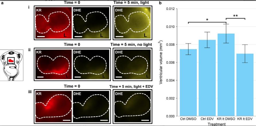 FIGURE 2 KillerRedâinduced hypertrophy is caused by superoxide production. (a) (i) Exposure of KillerRed (KR) expressing tadpoles to green light at NF stage 42 produces superoxide radicals, indicated by an increase in dihydroethidium (DHE) fluorescence in the heart (outlined). âLâ marks the liver, which is autofluorescent. (ii) Without light activation, KillerRed produces no superoxides. (iii) Exposure of KillerRedâexpressing tadpoles to the ROS scavenger edaravone (EDV) prevents lightâinduced production of superoxides. All scale bars are 100μm. (b) Exposure of KillerRedâexpressing tadpole hearts to EDV suppresses the lightâinduced ventricular hypertrophy seen in DMSO controls. Mean ventricular volume is shown (n = 34â39 tadpoles, N = 2 replicates), with error bars indicating 95% confidence intervals. *p < 0.05; **p < 0.01 (ANOVA with Tukey post hoc)