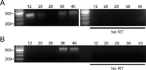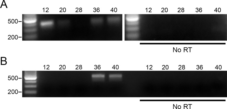 Fig 1. X. laevis embryonic stages show VSP mRNA transcripts expression.(A-B) Semi-quantitative RT-PCR (sqRT-PCR) of a panel of X. laevis embryos (NF stage 12–40) using PCR primers specific for Xl-VSP1 (A) and Xl-VSP2 (B). Both Xl-VSP1 and Xl-VSP2 transcripts appear to accumulate by stage 36. No bands were seen without reverse transcriptase (bottom). All cDNAs were made with equal amounts of total RNA as determined by spectrophotometry and confirmed by agarose gel electrophoresis to visualize ribosomal RNA bands (S1 Fig). sqRT-PCR was repeated at least two times with at least two different embryonic cohorts. The expected PCR amplicon sizes are 389 bp for Xl-VSP1 and 478 bp for Xl-VSP2. Shown are representative gels.
