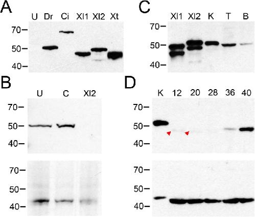Fig 3. X. laevis tissues and embryos show VSP protein expression.(A) Western blot validation of N432/21 anti-VSP in X. laevis oocytes injected with cRNA for Dr-VSP (Dr), FLAG-Ci-VSP (Ci), Xl-VSP1 (Xl1), Xl-VSP2 (Xl2), Xt-VSP (Xt), or left un-injected (U). All VSPs tested were recognized by the antibody. Un-injected oocytes (U) display no band. Dr-VSP, Xl-VSP1, Xl-VSP2 and Xt-VSP have a predicted MW of 58 kDa while FLAG-Ci-VSP has a predicted MW of 66 kDa. The slight difference in electrophoretic mobility between VSPs and their predicted MWs and the nature of the double band for Xl-VSP1 and Xl-VSP2 (as seen in panels A and C) has not been determined. These results show that anti-VSP N432/21 is specific for VSP and cross-reacts with VSPs from multiple species. (B) X. laevis zygotes were injected with either a control morpholino, an Xl-VSP2 morpholino or left un-injected. (top) Western blot analysis of equal amounts of lysates from embryos at stage 42 shows a band at the predicted MW for Xl-VSPs (58 kDa) for un-injected and control embryos and no band for the Xl2 morpholino-injected embryos. (bottom) Blots were stripped and re-probed with anti-actin for a loading control. (C) Western blot analysis of X. laevis tissues. Lysates from adult kidney (K, 3 μg), testis (T, 30 μg), and brain (B, 10 μg) were run against lysates from oocytes injected with RNAs for Xl-VSP1 (Xl1) and Xl-VSP2 (Xl2) and analyzed by Western blot with anti-VSP. A single band of approximately the correct MW (58 kDa) was observed in the tissue lysates, indicating the presence of Xl-VSP protein in all tissues tested. (D) Western blot analysis of X. laevis embryos. Lysates from NF stage 12–40 embryos (30 μg each) were run against a lysate from adult kidney (K, 5 μg). Blots were probed either with anti-VSP (top) or anti-actin (bottom) as a loading control (predicted MW 42 kDa). A weak band (potentially corresponding to Xl-VSP1) is present only at early embryonic stages 12–20 (red arrowheads), whereas a slightly slower-migrating band (potentially corresponding to Xl-VSP2) accumulates at later embryonic stages 36–40. The difference between the kidney and embryo lysate MWs for both VSP and actin may reflect a different degree of post-translational modification in embryos versus adult X. laevis. Lysates, gels and blots were repeated three times with either three different adults or three different embryonic cohorts. Shown are representative gels for each.