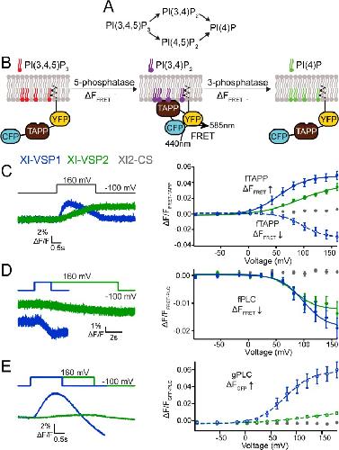 A voltage-sensing phosphatase, Ci-VSP, which shares sequence identity with PTEN, dephosphorylates phosphatidylinositol 4,5-bisphosphate.