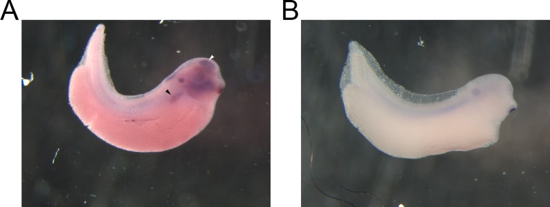 Fig 2. VSP mRNA is located in the pronephros and brain of X. laevis embryos.(A) In situ hybridization (ISH) of whole-mount NF stage 32 embryos. An anti-sense probe against Xl-VSPs shows Xl-VSP transcript in the proximal pronephritic field (black arrowhead) and brain (white arrowhead) of the embryos. This probe does not distinguish between Xl-VSP1 and Xl-VSP2 mRNAs because of the similarity between the two transcripts at the nucleotide level (93%). (B) No staining was observed by ISH in a sibling embryo with a sense control probe. ISH was repeated four times with four different embryonic cohorts. Shown are representative embryos.