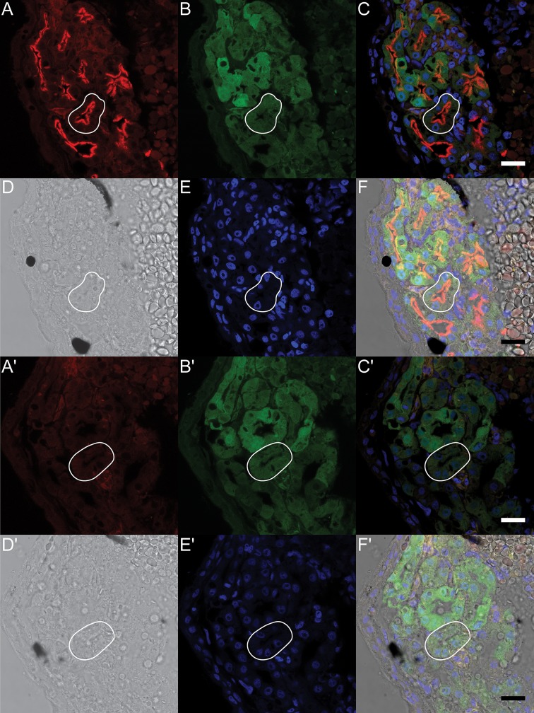 Fig 4. Xl-VSP protein is expressed on the lumenal surface of embryonic pronephroi.NF stage 42 Cdh17:GFP X. laevis embryos were sectioned and stained to test for VSP protein. Kidney tubules were identified by the presence of the Cdh17:GFP transgene (B, B'). Sections stained with anti-VSP (A) showed fluorescence on the lumenal surface (corresponding to the apical membrane) of the proximal kidney tubule cells (outlined in white). Anti-VSP staining was only observed in the presence of anti-VSP (A-F) and not in secondary antibody alone control sections (A'-F'). Panels (A, A') anti-VSP or no anti-VSP control; (B, B') GFP transgene; (C, C') fluorescence signal overlay of A, B and E; (D, D') bright field images; (E, E') Hoechst 33342 (to mark nuclei); (F, F') signal overlay of A, B, D and E. IHC was repeated three times with three different embryonic cohorts. Shown are representative sections. Scale bar = 25 μm.