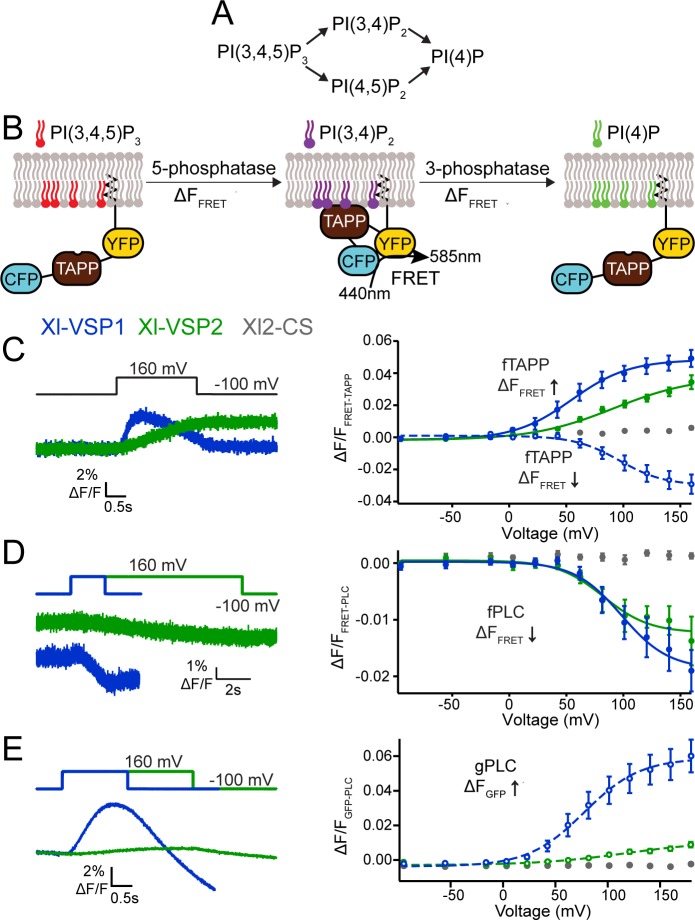 Fig 6. Xl-VSP1 and Xl-VSP2 function as voltage-regulated 5- and 3-phosphatases.(A) Schematics of the known VSP reactions. (B) Cartoon representation of fTAPP binding and release with increasing and decreasing PI(3,4)P2 concentrations. The binding of fTAPP to PI(3,4)P2 results in a conformational change that increases the FRET signal. Similarly, a reduction of PI(3,4)P2 results in a decrease in the FRET signal. Similar binding and release occurs with the fPLC sensor when PI(4,5)P2 concentrations are changed. (C) Oocytes were injected with fTAPP and either Xl-VSP1, Xl-VSP2 or Xl-VSP2 C301S (Xl2-CS), a catalytically inactivated protein. (left) Averaged fTAPP FRET traces over time during a voltage step from a holding potential of -100 to +160 mV. The FRET signal increases and decreases in the same pulse for Xl-VSP1 while it only increases for Xl-VSP2. (right) FRET measurements were tested at several voltages and the ΔF/F fTAPP FRET ratio was plotted versus the voltage (RV). The FRET increase (net 5-phosphatase reaction, solid line, closed symbols) was plotted by subtracting the baseline from the peak ΔF/F FRET ratio. The FRET decrease (net 3-phosphatase reaction, dashed line, open symbols) was plotted by subtracting the peak ΔF/F FRET ratio from the ΔF/F FRET ratio at the end of the voltage step. Xl-VSP1 shows robust activity as both a 3- and 5- phosphatase while Xl-VSP2 functions as a 5-phosphatase. (D) Oocytes were injected with fPLC and either Xl-VSP1, Xl-VSP2 or Xl2-CS. (left) Averaged fPLC FRET traces over time during a voltage step from a holding potential of -100 to +160 mV for fPLC co-expressed with either Xl-VSP1 or Xl-VSP2. The kinetics of activation are significantly faster for Xl-VSP1 than for Xl-VSP2. (right) The ΔF/F fPLC FRET RV shows a FRET decrease (net 5-phosphatase reaction, solid line, closed symbols) for both Xl-VSP1 and 2 indicating both dephosphorylate PI(4,5)P2. (E) Oocytes were injected with gPLC and either Xl-VSP1, Xl-VSP2 or Xl2-CS. (left) Averaged gPLC fluorescence traces over time during a voltage step from a holding potential of -100 to +160 mV for gPLC co-expressed with either Xl-VSP1 or Xl-VSP2. The kinetics of activation are significantly faster for Xl-VSP1 than for Xl-VSP2. (right) GFP fluorescence measurements were tested at several voltages and the fluorescence voltage relationship plotted showing a fluorescence increase (net 3-phosphatase reaction, dashed line, open symbols). While Xl-VSP1 shows significant levels of 3-phosphatase activity against PI(3,4,5)P3, Xl-VSP2 is a much less efficient 3-phosphatase. All error bars are ± SEM., n ≥ 9. Data fit with single Boltzmann equations. For each experiment, the oocyte was incubated in 8 μM insulin to increase PI(3,4,5)P3 concentrations.