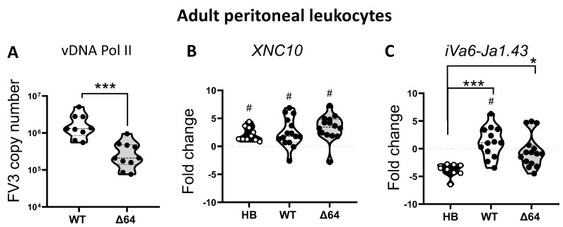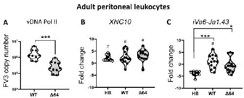 Figure 1. Effects of infection with attenuated knockout (KO) FV3 recombinant or bacterial stimulation on iVα6 T cell response. Peritoneal leukocytes (PLs) were collected at 1 dpi from adult frogs infected with 1 × 106 PFUs of WT-FV3 or ∆64-FV3, or 100 µl heat-killed (HB) E. coli. (A) Genome copy number using absolute qPCR with primers against FV3 DNA polymerase II. (B) XNC10 relative gene expression and (C) iVα6-Jα1.43 relative gene expression. Gene expression was determined relative to an endogenous control (GAPDH) and fold changes were calculated using the unstimulated sample (injected with equivalent volume of APBS) collected at the same time point. Data are pooled from three independent experiments with n = 4–5 animals in each experiment and each dot represents an individual animal. The line intersecting the y-axis at 0 represents the unstimulated control that the fold changes of the treatments are in relation to; (#) p < 0.05 significant differences compared to unchallenged (APBS) injected controls; (*) p < 0.05 and (***) p < 0.001 statistically significant differences between the indicated groups (one way ANOVA and Dunns’s multiple comparison test). |