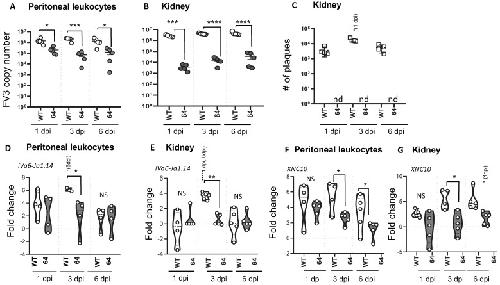 Figure 2. Magnitude of iVα6 T cell response in adult frogs is associated to the level of viral replication and production of infectious particles. PLs and kidneys were collected at 1, 3, and 6 dpi from adult frogs infected with 1 × 106 PFUs of WT-or ∆64-FV3. FV3 genome copy number by absolute qPCR in PLs (A) and kidneys (B) were determined. The total number of infectious particles (nd: not detected) in the kidney was determined by plaque assay (C).Gene expression of iVα6-Jα1.43 and XNC10 in PLs (D,F) and kidneys (E,G) were determined relative to an endogenous control (GAPDH) and fold changes were calculated using mock-infected frogs as a control. Each dot represents an individual animal (n = 4–5). The line intersecting the y-axis at 0 represents the APBS control that the fold changes of the treatments are in relation to. Note: * p < 0,05; ** p < 0.01; *** p < 0.001, and **** p < 0.0001 above the line denotes statistically significant differences between the different treatment groups; significant differences between time points within each treatment group are indicated within parentheses; NS indicates no significant differences (one way ANOVA and Dunns’s multiple comparison test). |