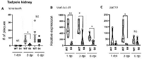 Figure 3. The iVα6 T cell response in tadpoles depends on active viral replication and productive FV3 infection. Three week-old (stage 55) tadpoles were infected with 10,000 PFUs of WT-or ∆64-FV3. At 1, 3, and 6 dpi, kidneys were collected and the total number of infectious particles was determined by plaque assay, respectively (A). Gene expression of iVα6-Jα1.43 (B) and XNC10 (C) was determined relative to an endogenous control (GAPDH) and relative expression was calculated against the lowest observed expression according to the ∆∆Ct method (n = 5). No iVα6-Jα1.43 transcripts were detected in the kidney uninfected tadpoles. * p < 0.05 and ** p < 0.01 above the line denotes statistically significant differences between treatment groups; NS indicates no significant differences (one way ANOVA and Dunn’s multiple comparison test). |