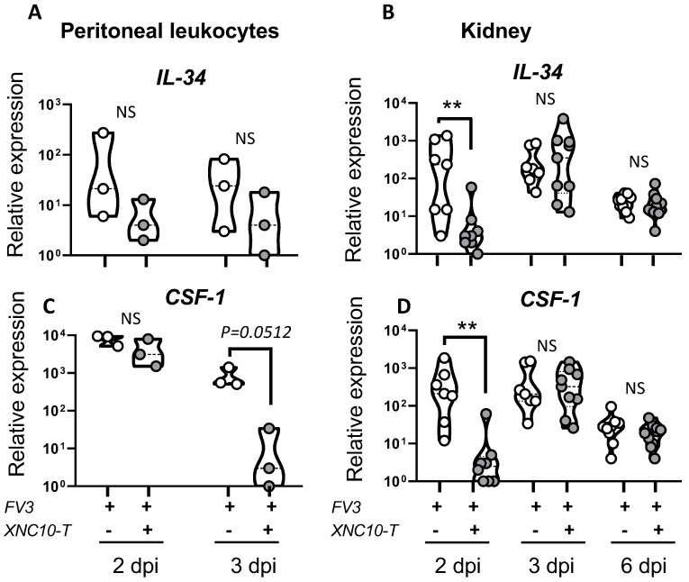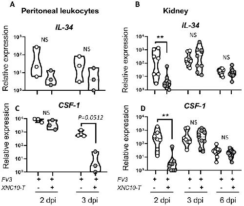Figure 6. Effect of XNC10 tetramer treatment on the expression of the macrophage stimulating factor genes CSF-1 and IL-34 in the peritoneal cavity and kidneys of FV3 infected tadpoles. PLs and kidneys were collected from three week-old (stage 55) tadpoles that had been injected with 1 μg XNC10 tetramers or vehicle control 1 day pre- and 1 day post-i.p. injection with 10,000 PFUs of FV3, at the indicated time points (n = 8â9). Quantitative gene expression analysis of IL-34 (A,B) and CSF-1(C,D) were determined relative to a endogenous control (GAPDH), and relative expression was calculated against the lowest observed expression according to the ââCt method (n = 9); ** p < 0.005 above the line denotes statistically significant differences between the different treatment groups; NS indicates no significant differences (One way ANOVA followed by Tukeyâs multiple comparison test). |