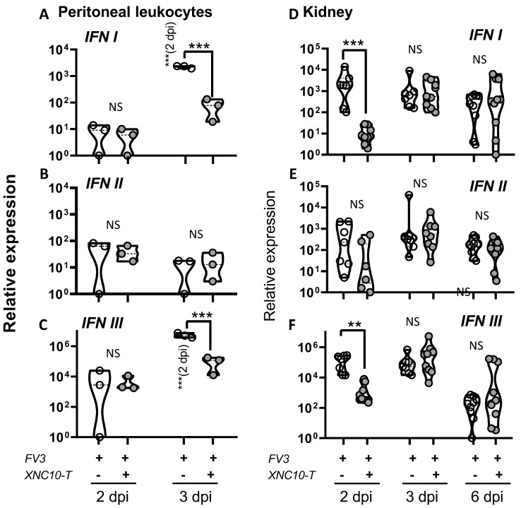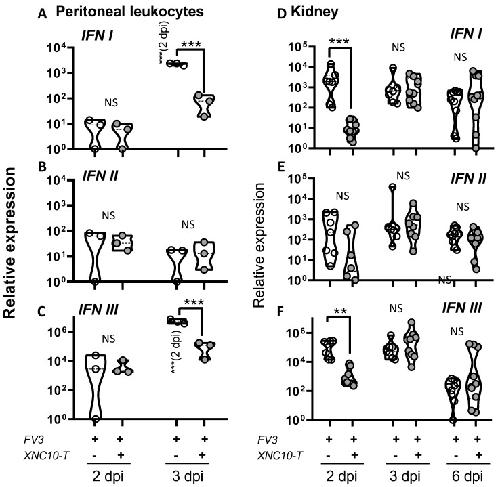 Figure 7. XNC10 tetramer treatment results in a delayed antiviral response in the peritoneal cavity and kidneys of FV3 infected tadpoles. PLs and kidneys were collected from three week-old (stage 55) tadpoles that had been injected with 1 μg XNC10 tetramers (XNC10-T) or vehicle control 1 day pre- and 1 day post-i.p. injection with 10,000 PFUs of FV3, at the indicated time points (n = 8–9). Quantitative gene expression analysis of type I (A,D), type II (B,E), and type III IFN (C,F) were determined relative to a endogenous control (GAPDH), and relative expression was calculated against the lowest observed expression according to the ∆∆Ct method (n = 9); * p < 0.05, ** p < 0.005, and *** p < 0.001 above the line denote statistically significant differences between the different treatment groups; significant differences between time points within each treatment group is indicated within parentheses; NS indicates no significant differences (One way ANOVA followed by Tukey’s multiple comparison test). |