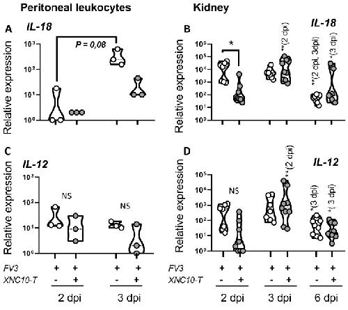 Figure 8. Effects of iVα6T cell depletion on IL-18 and IL-12 responses. PLs and kidneys were collected from three week-old (stage 55) tadpoles that had been injected with 1 μg XNC10 tetramers (XNC10-T) or vehicle control 1 day pre- and 1 day post-i.p. injection with 10,000 PFUs of FV3, at the indicated time points (n = 8–9). Quantitative gene expression of IL-18 (A,B) and type IL-12 (C,D) was determined relative to an endogenous control (GAPDH) and relative expression was calculated against the lowest observed expression according to the ∆∆Ct method (n = 9); * p < 0.05; ** p < 0.005, above the line denotes statistically significant differences between the different treatment groups; significant differences between time points within each treatment group is indicated within parentheses; NS indicates no significant differences (One way ANOVA followed by Tukey’s multiple comparisons test). |
