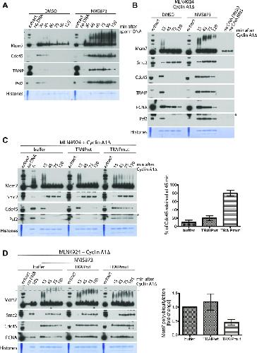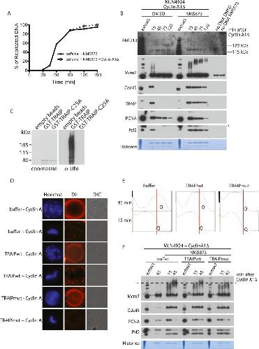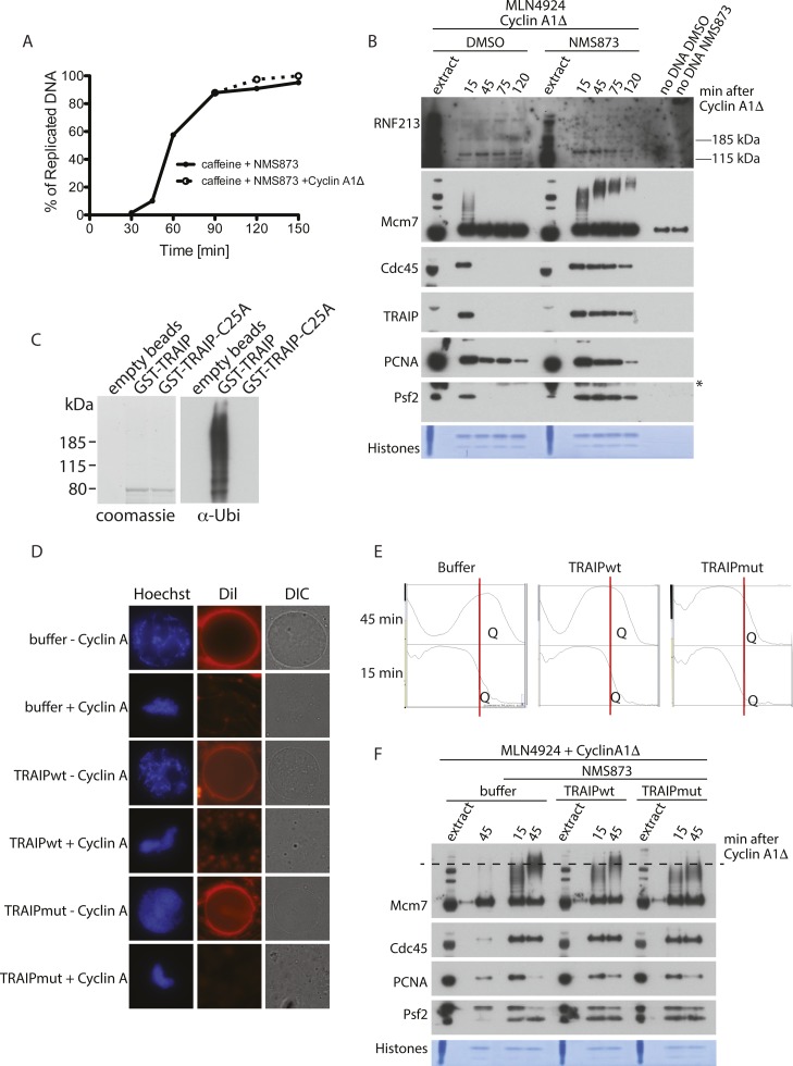 Figure S3. TRAIP activity is required for Mcm7 ubiquitylation in mitosis.(A) DNA synthesis kinetics for experiment presented in Fig 2. Progression of the replication reaction was measured by incorporation of radioactive dATP into the DNA. P32α-dATP was added to the extract at the beginning of the reaction together with sperm DNA and caffeine. NMS873 was added 15 min after sperm DNA addition and cyclin A1Δ was optionally added at 90 min. (B) The same experiment from Fig 3B but with addition of the RNF213 blot. (C) TRAIPmut C25A is inactive. A TRAIP autoubiquitylation in vitro reaction was set up with wt GST-tagged TRAIP or RING-mutant (C25A) TRAIP as described in the Materials and Methods section and autoubiquitylation of TRAIP observed through detection of the ubiquitin signal. (D) Mitotic nuclear envelope breakdown in the presence of TRAIPwt and TRAIPmut. The replication reaction was completed and optionally driven into mitosis by addition of cyclin A1Δ. The extract was then supplemented optionally with LFB1/50 buffer, wt His/SUMO–tagged TRAIP, or RING-mutant (C25A) TRAIP to a final concentration of 50 μg/ml. The nuclei assembled in the extract were visualised at 30 min post cyclin A1Δ addition by staining DNA with Hoechst 33258, staining nuclear membrane with Dil, and visualising the nuclear envelope by differential interference contrast (DIC) microscopy. (E) An example of the plots gathered during quantification of Mcm7 polyubiquitylation in Fig 3D, as described in the Materials and Methods section, using Image J. The red line represents the cutoff point between the S-phase versus mitotic polyubiquitylated Mcm7. “Q” indicates the region of the plot which was measured. (F) Inhibition of mitotic Mcm7 ubiquitylation by GST-TRAIPmut. The replication reaction was completed in the presence of the Cullin ligase inhibitor MLN4924 and driven into mitosis by addition of cyclin A1Δ. At the same time as cyclin A1Δ, the reaction was optionally supplemented with p97 inhibitor NMS873 and LFB1/50 buffer, wt GST-TRAIP, or RING-mutant (C25A) GST-TRAIP at 30 μg/ml. Chromatin samples were isolated at indicated time points and analysed by immunoblotting with indicated antibodies. The dashed line on the Mcm7 blot runs through the middle of the ubiquitylation signal for Mcm7 in mitosis in the control (buffer) sample to aid comparison of chain lengths between samples. An asterisk “*” by the Psf2 blot indicates the band of cyclin A1Δ that is recognised by the Psf2 antibody. |