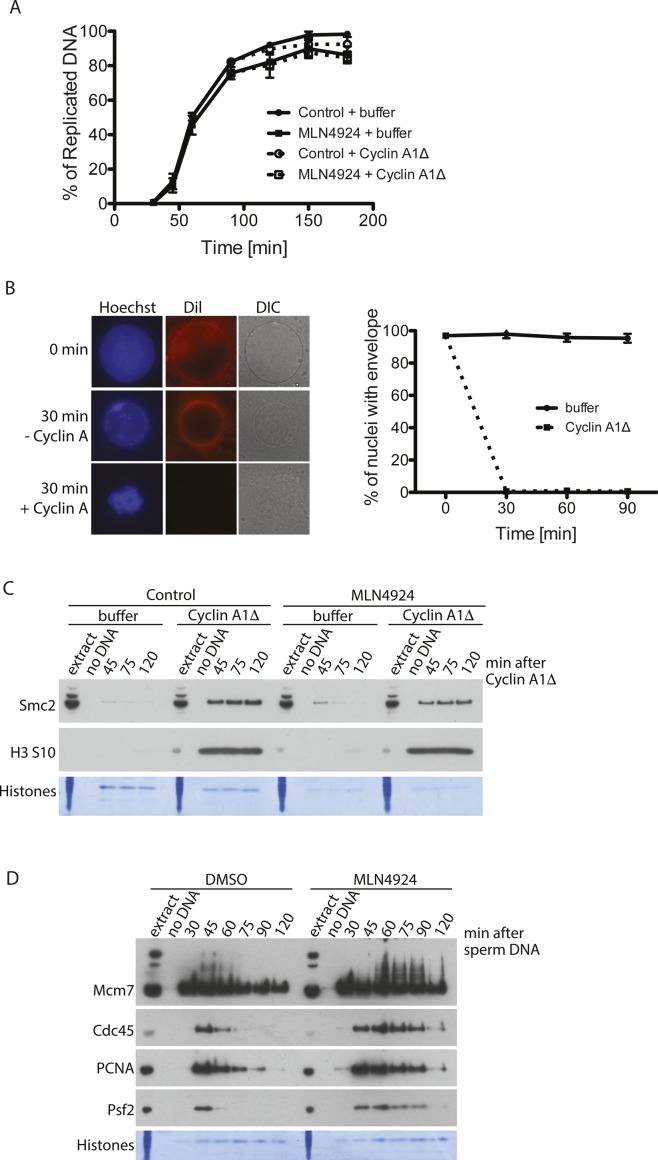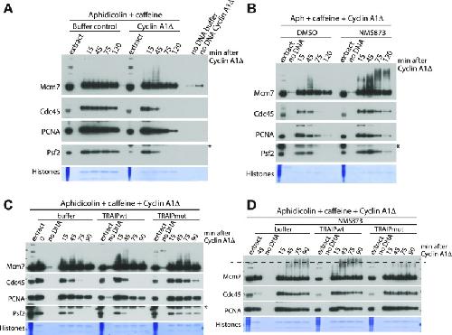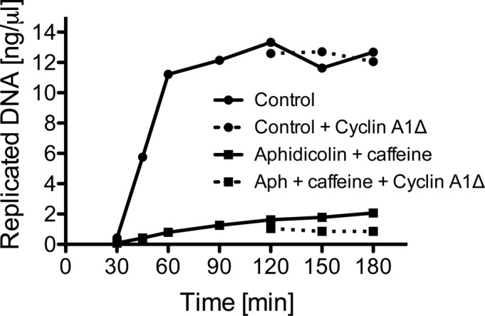 Figure S6. DNA synthesis blocked by addition of aphidicolin and caffeine is not then stimulated by cyclin A1Δ addition.Sperm DNA was replicated in the extract optionally supplemented with aphidicolin and caffeine. At 90 min, cyclin A1Δ was optionally added. DNA synthesis was analysed as in Fig S1A. |