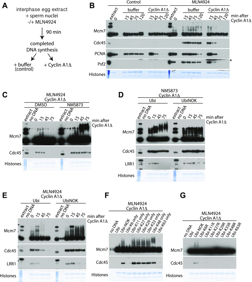 Figure 1. Mcm7 is ubiquitylated with K6 and K63 ubiquitin chains in mitosis and removed from chromatin by p97 segregase.(A) Experimental design for driving egg extract into mitosis. (B) Experiment following design in (A). DNA was replicated to completion (90 min) in egg extract supplemented optionally with a Cullin ligase inhibitor MLN4924. After completion of the replication reaction, cyclin A1Δ was optionally added to the extract to drive extract into mitosis. Chromatin was isolated at indicated time points after cyclin A1Δ addition and chromatin samples analysed by Western blotting with the indicated antibodies. Time “0” sample was isolated at the replication completion time when cyclin A1Δ was added to the extract. Colloidal Coomassie-stained histones serve as a quality and loading control. An asterisk “*” by the Psf2 blot indicates a band of cyclin A1Δ that is recognised by Psf2 antibody. (C) The replication reaction was completed in the presence of Cullin ligase inhibitor MLN4924 and driven into mitosis by addition of cyclin A1Δ. At the same time as cyclin A1Δ, half of the sample was supplemented additionally with p97 inhibitor NMS873. Chromatin samples were isolated at indicated time points and analysed as in (B). A sample without DNA addition (no DNA) was processed alongside others as a chromatin specificity control. (D) The replication reaction was completed in the presence of p97 inhibitor NMS873 and driven into mitosis by addition of cyclin A1Δ. At the same time as cyclin A1Δ, the samples were supplemented with recombinant wt ubiquitin or UbiNOK. Chromatin samples were analysed as above. (E) Experiment as in (D) but replication reaction was carried out in the presence of Cullin ligase inhibitor MLN4924 instead of p97 inhibitor NMS873. (F, G) Replication reaction was completed in the presence of Cullin ligase inhibitor MLN4924 and driven into mitosis by addition of cyclin A1Δ. At the same time as cyclin A1Δ addition, the extract was supplemented with the indicated mutants of ubiquitin. Chromatin was isolated at 75 min after cyclin A1Δ addition and analysed by Western blotting as above.Source data are available for this figure. |