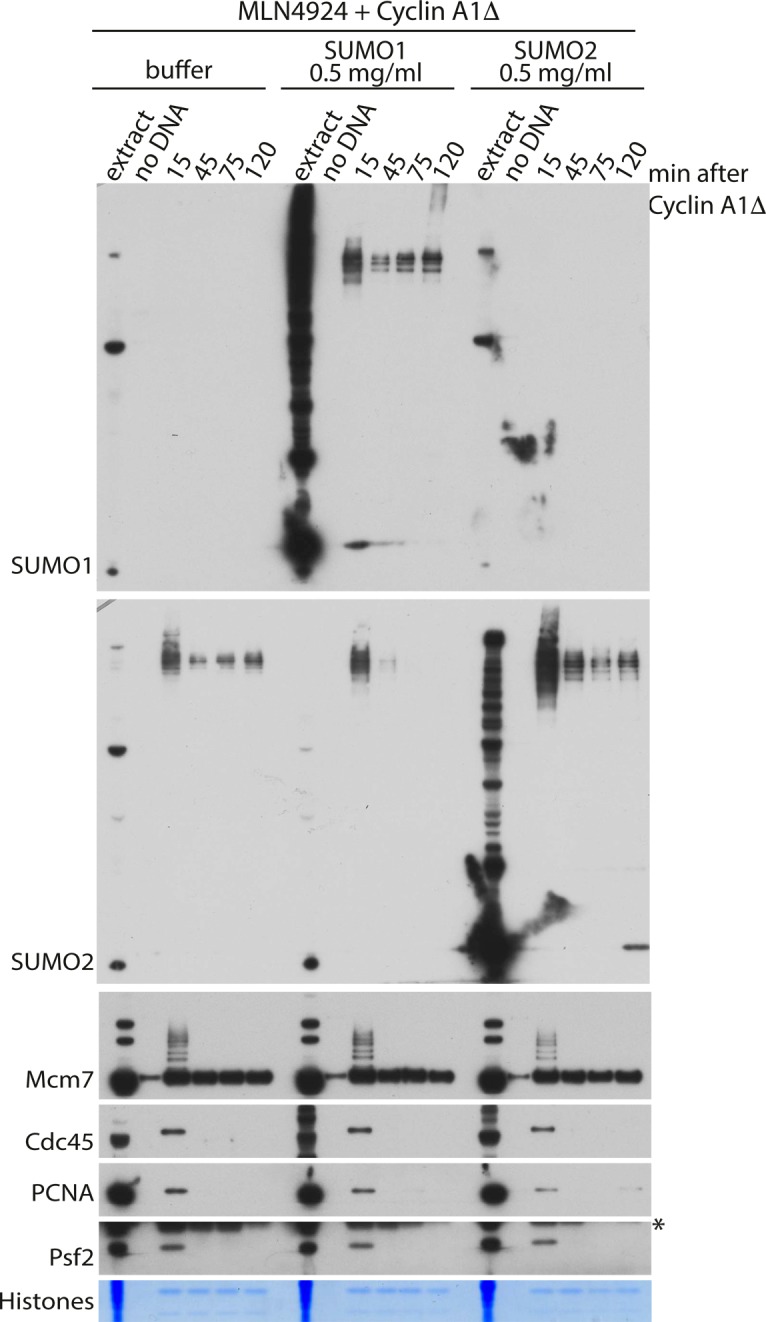 Figure S4. Mitotic replisome disassembly is not affected by stimulation of SUMOylation.The replication reaction was completed in the presence of the Cullin ligase inhibitor MLN4924 and driven into mitosis by addition of cyclin A1Δ. At the same time as cyclin A1Δ, the extract was optionally supplemented with LFB1/50 buffer, SUMO1, or SUMO2. The chromatin samples were isolated at indicated time points and analysed as in Fig 1. |