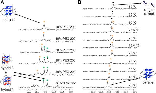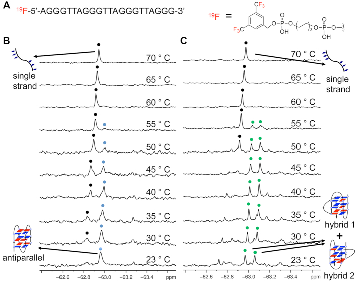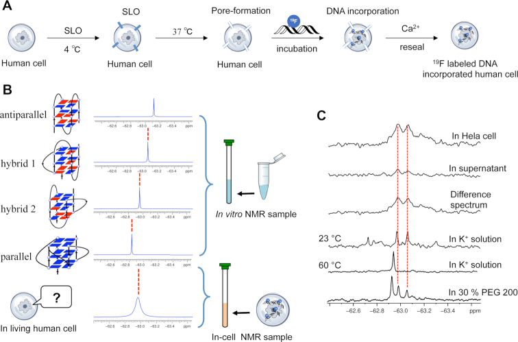 Although the telomeric sequence has been reported to form various G-quadruplex topologies in vitro and in Xenopus laevis oocytes, in living human cells, the topology of telomeric DNA G-quadruplex remains a challenge. To investigate the human telomeric DNA G-quadruplex in a more realistic human cell environment, in the present study, we demonstrated that the telomeric DNA sequence can form two hybrid-type and two-tetrad antiparallel G-quadruplex structures by in-cell 19F NMR in living human cells (HELA CELLS). This result provides valuable information for understanding the structures of human telomeric DNA in living human cells and for the design of new drugs that target telomeric DNA.