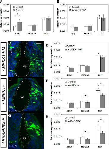 Figure 5. Activation of the MAPK pathway is sufficient to inhibit both sema3a and slit1 expression in the forebrain. Constructs for Fgfr downstream signaling intermediates were electroporated into the forebrain of stage 27/28 embryos, and spry1, sema3a, and slit1 expression in the forebrain were quantified by RT-qPCR 24 h after electroporation (stage 32). A, B, RT-qPCR when PLCγ signaling was augmented by pEYFP-PLCγ (A, PLCγ n = 32 brains, N = 4 vs control n = 31, N = 4), and inhibited with the PLCγ-deficient FGFR1, phRluc-N1-FGFR1Y766F (B, FGFR1Y766F n = 22 brains, N = 3 vs control n = 24, N = 3). CâG, The MAPK pathway was inhibited with a DN MEKK1, pCS2-MEKK1-KM, and activated with either pCS2-MEKK1+ or pCS108-BRAFV600E. Immunohistochemistry on transverse sections of the forebrain against myc (C, E) and GFP (G) tags confirm successful electroporations. Changes in gene expression was quantified by RT-qPCR after electroporation with MEKK1-KM (D, n = 30, N = 4), MEKK1+ (F, n = 28, N = 4), and BRAFV600E (H, n = 32, N = 4) and compared to control pCS2-GFP electroporation (D, F, H, n = 31, N = 4). Bars represent the mean ± SEM; *p < 0.05 using the REST algorithm for statistical significance. Scale bar, 50 µm. ve, ventricle. |