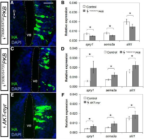 Figure 6. Akt signaling positively regulates sema3a and slit1 in the forebrain. Plasmids encoding DN AKT (A, B) T308A/S473APKB, and CA AKT (C, D) T308D/S473DPKB, and (E, F) AKT-myr were electroporated into the forebrain of stage 27/28 embryos. A, C, E, Forebrain transgene expression was assessed by immunohistochemistry for HA-tagged AKT mutants. B, D, F, spry1, sema3a, and slit1 expression in the forebrain 24 h after electroporation was quantified by RT-qPCR for (B) T308A/S473APKB (n = 21, N = 3 vs control n = 23, N = 3), (D) T308D/S473DPKB (n = 40, N = 5 vs control n = 39, N = 5), and (F) AKT-myr (n = 22, N = 3 vs control n = 24, N = 3), where the control electroporation was pCS2-GFP. Bars represent the mean ± SEM; *p < 0.05 using the REST algorithm for statistical significance. Scale bar, 50 µm. ve, ventricle. |