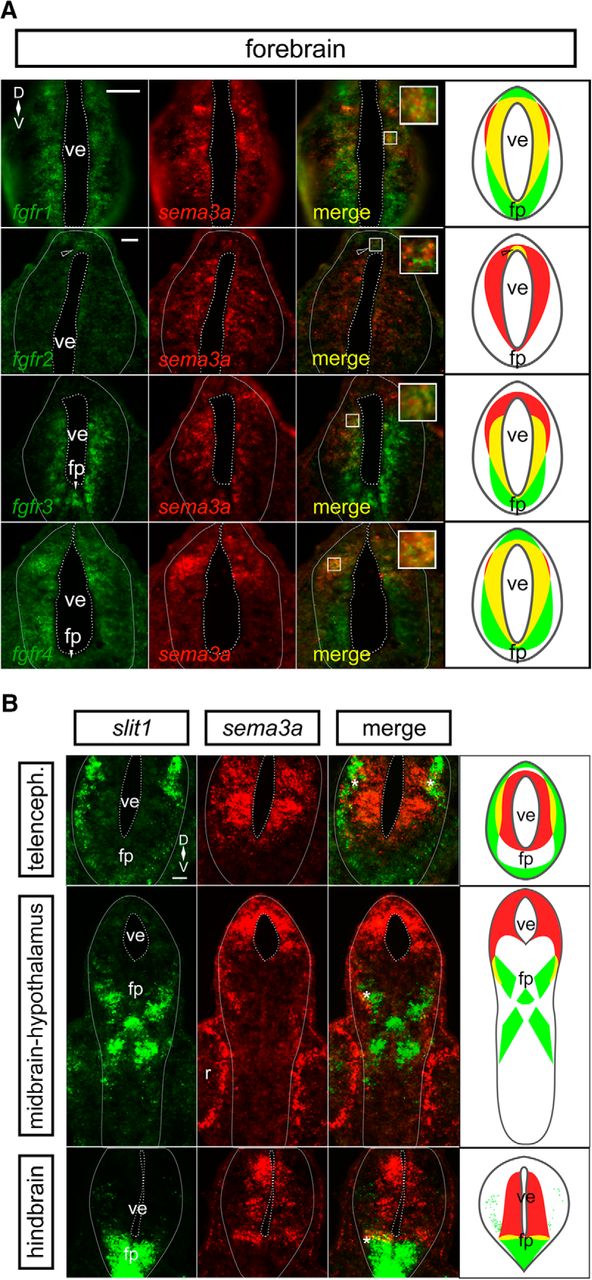 Figure 1. sema3a is co-expressed with fgfrs in the embryonic forebrain, but in complementary domains to slit1. A, dFISH on transverse sections through the forebrain using specific antisense riboprobes against fgfr1-4 (green) and sema3a (red). There is co-expression (yellow) of sema3a with all fgfrs in the ventricular zone of the forebrain. The insets reveal co-localization of dFISH signal. The rightmost column shows cartoons of the fgfr (green) and sema3a (red) domains, with co-expression in yellow. The fgfr2 region of co-expression is restricted to the dorsal ventricular zone (unfilled arrowhead). B, dFISH on transverse sections through the forebrain by using specific antisense riboprobes against slit1 (green) and sema3a (red). sema3a is expressed by cells around the forebrain ventricle, whereas slit1 is localized to the pial cells and the floor plate of the neural tube. There is some limited co-expression (yellow) of sema3a and slit1 at the interface (asterisk) of the two expression domains. The rightmost column shows cartoons of the slit1 (green) and sema3a (red) domains, with co-expression in yellow. Scale bars, 50 µm. fp, floor plate; ve, ventricle. |