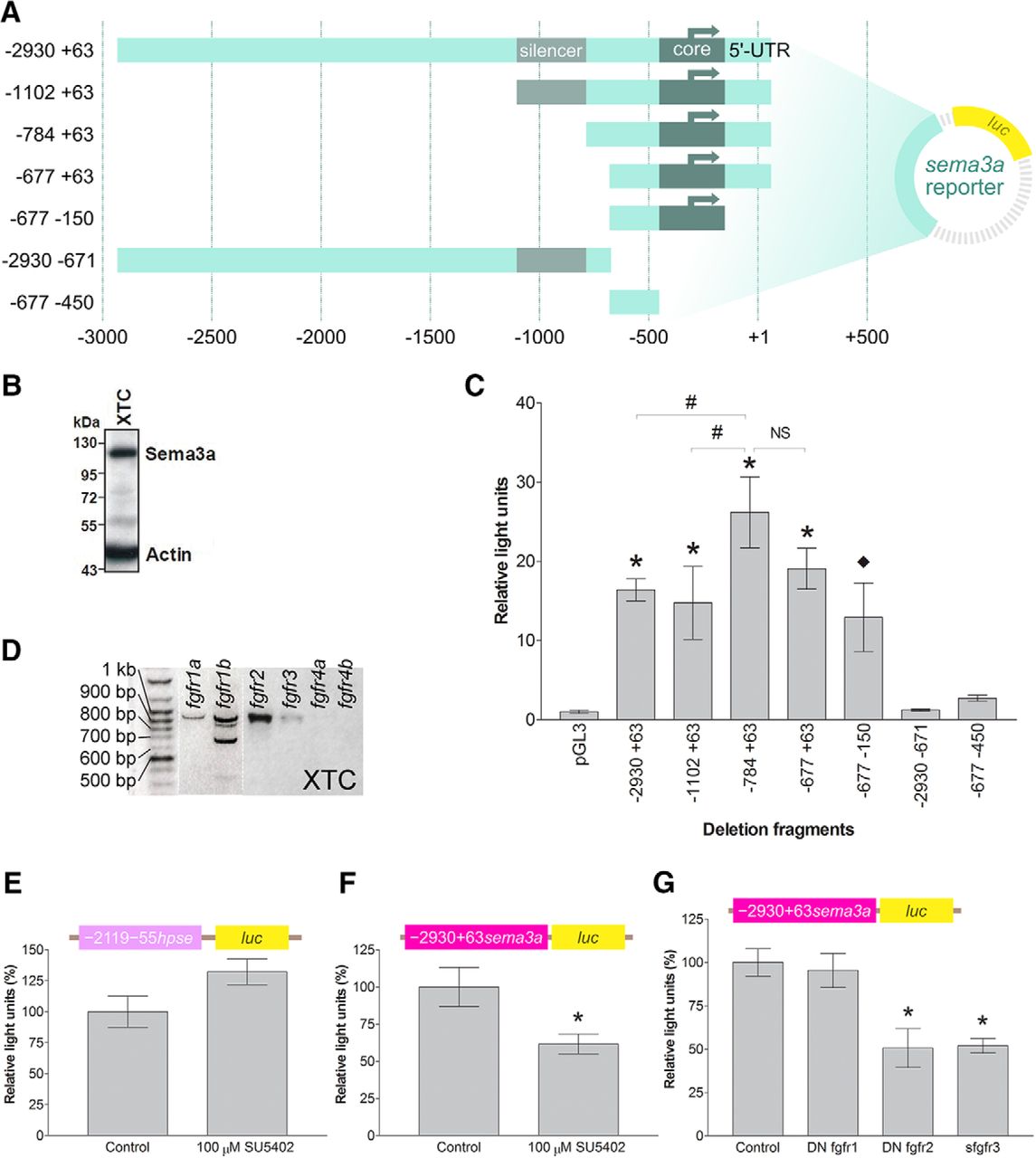 Figure 2. Characterization of the sema3a promoter. A, Schematic of the sema3a deletion fragments inserted upstream of the firefly luciferase (luc) gene in the pGL3 vector. B, XTC cells express endogenous Sema3a protein by Western blotting. C, The reporter constructs of the sema3a promoter fragments and the Renilla luciferase construct were co-transfected into XTC cells. Luminescence corresponding to each deletion fragment was normalized to Renilla to account for transfection efficiency and expressed as relative light units compared to the promoterless pGL3 basic vector. Each bar represents mean ± SEM from n = 9 wells, N = 3. Statistical significance was determined by one-way ANOVA (α = 0.05) and the following post hoc tests: â¦p < 0.05 and *p < 0.01 by Dunnettâs multiple comparison test versus the control (pGL3 vector) and #p < 0.05 by Bonferroniâs multiple comparison test between selected deletion fragments. D, Expression of fgfr genes in XTC cells, shown by RT-PCR. XTC cells express all the fgfr genes (as verified by sequencing of amplicons) except for fgfr4a/b. Of note, the fgfr1b amplicons smaller than 900 bp may be alternatively spliced variants (Friesel and Dawid, 1991). E, F, The heparanase promoter construct (E, n = 12 wells, N = 2 for both bars), â2119 â55 hpse::luc, and the â2930 +63 sema3a::luc construct (F, n = 12 wells, N = 3 for both bars) were co-transfected into XTC cells in 96-well plates with the Renilla luciferase plasmid and treated with 100 µM SU5402. Bars reflect mean ± SEM; *p < 0.05, compared to DMSO control, two-tailed Studentâs t test. G, â2930 +63 sema3a::luc was co-transfected with truncated fgfrs in XTC cells (N = 7 for all bars; control n = 30 wells, DN fgfr1 n = 16 wells, DN fgfr2 n = 12 wells, sfgfr3 n = 14 wells). Bars reflect mean ± SEM; *p < 0.05 by ANOVA and Bonferroni post hoc test compared to pCS2-GFP transfection as control. |
