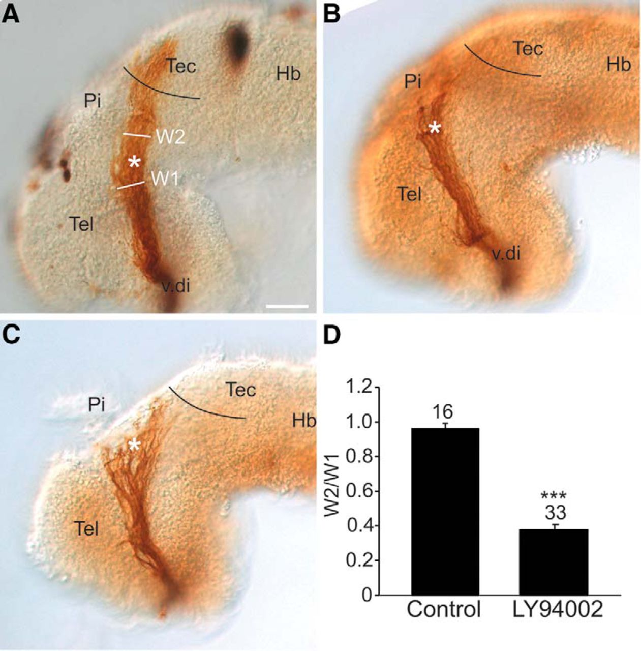Figure 7. PI3K signaling regulates the behavior of RGC axons at the mid-diencephalic turn. Lateral views of stage 40 wholemount brains with HRP-labeled optic tracts that were exposed at stage 33/34 either to (A) control DMSO solution (n = 16 brains, N = 3) or (B, C) 20 µM LY294002 (n = 33 brains, N = 3). Black line represents the approximate anterior border of the optic tectum, and the asterisk the location of the mid-diencephalic turn guidance choice point. D, The RGC axon stall phenotype was quantified by representing the width of the optic tract post-mid-diencephalic turn (W2) as a ratio (W2/W1) to the width of the optic tract (W1) at the mid-diencephalic turn. On each bar is the number of individual brains pooled from 3 independent experiments. Bars represent the mean ± SEM; ***p < 0.001 using the unpaired Studentâs t test. Scale bar, 50 µm. Hb, hindbrain; Pi, pineal gland; Tec, tectum; Tel, telencephalon; v.di, ventral diencephalon. |