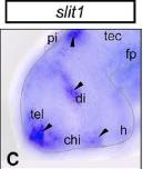 slit1 (slit guidance ligand 1) gene expression in brain of Xenopus laevis embryo, assayed via in situ hybridization, NF stage 32, lateral view, anterior left, dorsal up. |