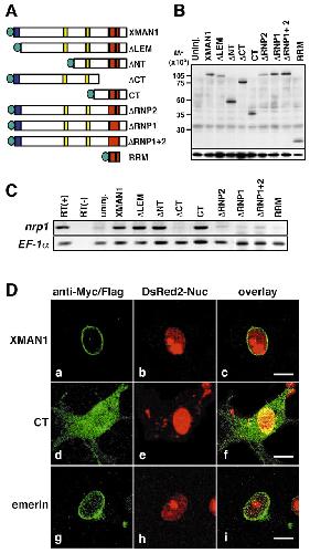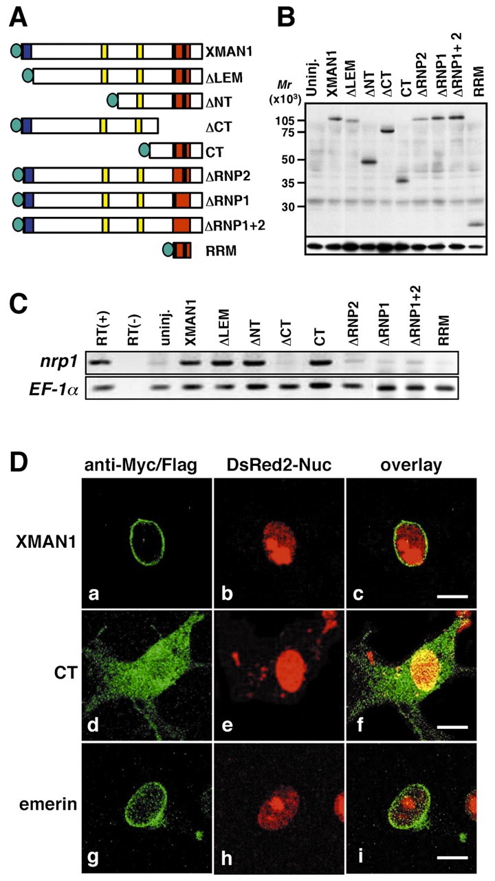 Fig. 4. Neuralizing activity of XMAN1 resides in the C-terminal region. (A) Schematic representation of XMAN1 deletion mutants. LEM domains, transmembrane domains and RRMs are depicted as in Fig. 2A. Circles indicate Myc tags. (B) Western blot for analyzing the expression level of the XMAN1 deletion mutants. Extracts prepared from stage 11 gastrula embryos expressing XMAN1 deletion mutants were immunoblotted with anti-Myc antibody (upper panel) or anti-β-tubulin antibody (lower panel; loading control). (C) Mapping of neuralizing activity of XMAN1. RT-PCR analysis for nrp1 was performed with animal caps at the equivalent of the tailbud stage 25. Doses of injected mRNA: 500 pg per embryo. (D) Confocal microscopic analysis of the subcellular localization of Myc-tagged XMAN1 (a-c), Flag-tagged XMAN1-CT (d-f) and Myc-tagged human emerin (g-i) expressed in COS-7 cells (green). Nuclei (red) were visualized by co-transfecting with the DsRed2-Nuc vector. Scale bars: 10 μm.