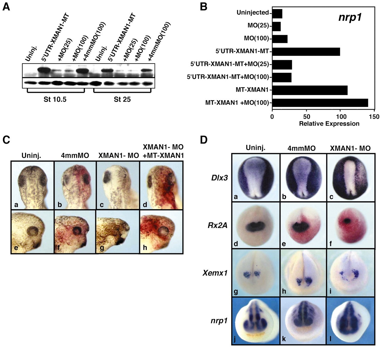 Fig. 8. Roles of XMAN1 during Xenopus development. (A) XMAN1 antisense morpholino oligo (XMAN1-MO) inhibits the translation from synthetic XMAN1 mRNA. Extracts prepared from stage 10.5 and stage 25 embryos injected with Myc-tagged XMAN1 mRNA possessing the XMAN1-MO annealing sequence (5â²UTR-XMAN1-MT) together with XMAN1-MO or XMAN1-4mmMO (doses in ng per embryo are in parentheses) were subjected to immunoblotting with anti-Myc antibody (upper panel) and with anti-β-tubulin antibody (lower panel). (B) XMAN1-MO suppresses neural induction by XMAN1. Real-time RT-PCR analysis for nrp1 with animal caps at the equivalent of stage 25. Doses of injected mRNA, 500 pg per embryos. Doses of XMAN1-MO are indicated in parentheses (ng per embryo). (C) Morphological appearance of injected embryos. XMAN1-4mmMO (b,f), XMAN1-MO (c,g) and XMAN1-MO plus MT-XMAN1 mRNA (d,h) were injected together with β-gal mRNA as a tracer (b-d,f-h) into two right animal blastomeres at the four-cell stage. XMAN1-MO injection caused a reduced eye on the injected side (c,g), which is rescued by co-injection of MT-XMAN1 mRNA (d,h). Injected doses (per blastomere): MOs, 25 ng; MT-XMAN1 mRNA, 67.5 pg; β-gal mRNA, 15 pg. a-d, dorsal view (anterior is upwards); e-h, lateral view of a-d, respectively, showing the right side of the embryos. (D) Whole-mount in situ analysis for Dlx3 (epidermis, stage 13), Rx2A (eye, stage 20), Xemx1 (telencephalon, stage 20) and nrp1 (pan-neural, stage 20) expression in uninjected, XMAN1-4mmMO- and XMAN1-MO-injected embryos as indicated. a-c, dorsal view (anterior is upwards); d-l, anterior view (dorsal is upwards). β-Gal mRNA was co-injected in b,c,e,f.