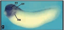 Fig. 3. Temporospatial expression of XMAN1. (A) Analysis of temporal expression pattern of XMAN1 by RT-PCR with RNA from various developmental stages. FGFR, a loading control. (B) Whole-mount in situ analysis of Xenopus embryos at early gastrula (a-c), neurula (d-f) and tadpole (g,h) stages. c and e show cross-sections of b and d, respectively. f represents a close view of the dorsal region of e. h shows a dorsal view of the head region of g. Arrows, dorsal blastopore groove. nc, neural crest; nt, notochord; fp, floor plate; el, epithelial layer; sl, sensory layer; ey, eye; ov, otic vesicle; ba, branchial arches.