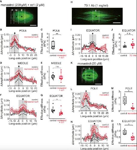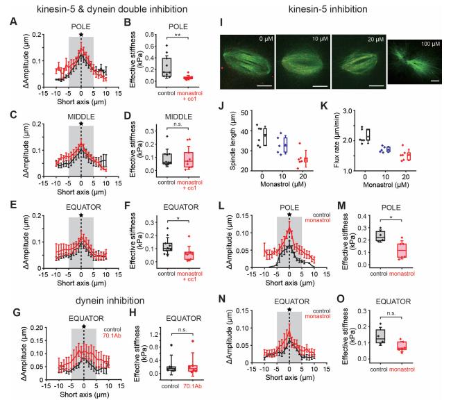 Figure S6. Additional data for molecular perturbation experiments, related to Figure 5 (AâF) Doubly-inhibited spindle data. Motion amplitude profiles (A, C, E) and the local effective stiffness (B, D, F), analyzed for the short spindle axis and for forces applied near the pole (A, B), at the middle of the spindle half (C, D), and near the equator (E, F). (G, H) Dynein-inhibited spindle data. Motion amplitude profile (G) and the local spindle stiffness (H), analyzed for force applied near the spindle equator. (IâO) Kinesin-5 inhibited spindle data. (I) Representative confocal images of spindles treated with monastrol at indicated concentrations. All scale bars are 10 µm. (J) Average flux rate versus monastrol concentration. (K) Overall spindle length versus monastrol concentration. Box plots are SD (bars), 25th and 75th percentiles (box ends), median (center bar), and mean (cross). Data are from n = 6, 5, and 6 spindles for control, 10 µM monastrol, and 20 µM monastrol, respectively. (LâO) Short-axis motion amplitude profiles (L, N) and the local effective stiffness (M, O), analyzed for forces applied at the pole (L, M) and the equator (N, O). Dataset analyzed are the same as in Fig. 5, panels BâH (double inhibition), JâK (dynein inhibition), and MâP (kinesin-5 inhibition). Red and black traces in each amplitude profile indicate data for test and control spindles, respectively. *p<0.05, **p<0.01, MannWhitney U-test. n.s., not significant. |