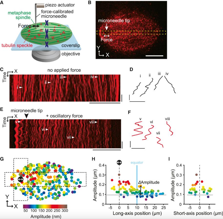 Figure 1. Microneedle-Based Setup for Analyzing Spindle Microtubule Mechanics In Situ (A) Schematic of the setup. Single metaphase spindles, assembled in Xenopus egg extracts and supplemented with X-rhodamine tubulin (20 nM) for microtubule motion tracking, can be subjected to a calibrated nN-order force via the microneedle tip (black double arrow). Microtubule motion responses can be analyzed by tracking fluorescent tubulin âspecklesâ incorporated into the filament lattices (red dots). (B) Representative confocal fluorescence image of a spindle, to which a microneedle tip (arrowhead) was inserted and an external force was applied (double arrow). Yellow rectangle indicates the region used for kymograph analysis in (E). (CâF) Speckle motion dynamics. Kymograph generated along the pole-to-pole axis of a spindle (C and E) and representative speckle trajectories (D and F), showing the motion of tubulin speckles in the absence (C and D) and presence (E and F) of an applied force. An externally applied oscillatory force (frequency: 0.1 Hz; amplitude: 0.2 nN) could induce a periodic back-and-forth speckle movement while the overall filament dynamics persisted. Roman numbers above each trace correspond to those in the kymographs. Scale bars, 10 μm (horizontal) and 10 s (vertical). (G) Speckle motion amplitude heatmap. Amplitude of speckle motion response upon application of oscillatory force was determined by sine-wave fitting of each trajectory and mapped onto a single plane. Warmer color indicates larger response amplitude. Black circle with arrowheads indicate force application position and direction. (H and I) Cross-section of the speckle motion amplitude heatmap along the long (H) and short (I) spindle axes. Plots within dotted rectangles in (G) (width: 5 μm) were projected onto each axis. Each speckle displacement relative to the structureâs edge (ÎAmplitude; vertical double-arrow above gray horizontal line) was calculated and used for subsequent analyses. Blue vertical line indicates spindle equator position. See also Figure S1. |