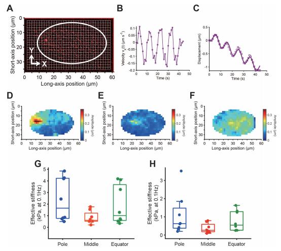 Figure S2. Particle image velocimetry (PIV) analysis on the oscillatory force perturbation experiment, related to Figures 1 and 2 (A) Schematic picture of PIV analysis, performed for speckle images acquired in the oscillatory force perturbation experiment. In the analysis, square grids (1.68 µmÃ1.68 µm) are overlaid onto a spindle, which is indicated by the white ellipse. Red color indicates speckle signal. PIV calculates the spatial correlation between two successive images in the time-lapse, yielding the average velocity of multiple speckles at the center of each grid. The x- and y-coordinates are the spindleâs long and short axis, respectively. (B, C) Velocity field (vx(t), vy(t)) of speckle movement that arose in response to an applied oscillatory force (frequency: 0.1 Hz) was analyzed by PIV image processing. The time-evolution of vx(t) (B) obtained in each PIV window was converted to displacement time course x(t) (C), according to x(t + dt) = x(t) + vx(t)dt, at the resolution of dt = 1 s. The amplitude of speckle motion response A was then obtained by fitting the calculated x(t) (open circles) to the sinusoidal curve (solid line), a0 + a1t + A sin(Ït + θ), where fitting parameters a0 and a1 are for the initial position and flux velocity, respectively. (DâF) The spatial profile of amplitude A was drawn as a two-dimensional heat map. Warmer color represents larger displacement along the long spindle axis. Typical heat map is shown for each case, in which force was applied near the spindle pole (D), at the middle of the spindle half (E), and near the equator (F). (G, H) Local effective stiffness at each spindle region (pole, middle, equator) was estimated in the amplitude profile within ±5 µm from the peak. The stiffness values (filled circles) estimated for the long (G) and short spindle axis (H) are displayed with box plots; each box extends from the 25th to 75th percentiles, with a line at the median. |