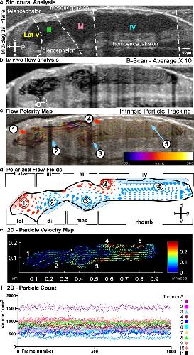 Figure 2. Imaging ventricular CSF flow with OCT. (a) Mid-sagittal view of the brain allowing simultaneous visualization of the four ventricles. (b) B-scan image acquisition using OCT: Ventricles of a stage 45 tadpole harbor native free floating particles. In this image, the spatial position of the particles are recorded over time to demonstrate discrete flow patterns within each ventricle (OT: optical tectum). (c) Intrinsic Particle Tracking: Using ImageJ, we tracked particles using 300 frames of 2D images. Temporal color coding depicts their trajectory over time. Color bar represents color versus corresponding frame number in the color-coded image. Based on the trajectory map, 5 distinct flow fields were observed: FF1-FF5. We numbered flow fields 1 to 5 along the anterior-posterior axis. FF 1-Telencephalic flow and FF 2-Diencephalic flow are in the lateral ventricle. FF 3-Mesencephalic flow is in the 3rd ventricle. Finally, the 4th ventricle has 2 flow fields: FF 4-Anterior Rhombencephalic flow and FF 5-Posterior Rhombencephalic flow. (d) Outline of the ventricular system and vector maps of the CSF flow fields. Based on the trajectory map and real time observation (Movie 3); FF1 and FF4 are clockwise and FF2, 3 and 5 are counter-clockwise. (e) 2D Particle Velocity Map: Particle trajectories averaged across all frames (1000) to form flow velocities (see methods for details). Based on the particle velocity map and real time observations FF1 and FF2 are relatively slower compared to FF 3, 4 and 5. The fastest flow is recorded within the 4th ventricle. (f) 2D Particle Count (nâ=â11): Over 1000 frames, total particle number are counted for 11 different wild type tadpoles and plotted for each frame. |