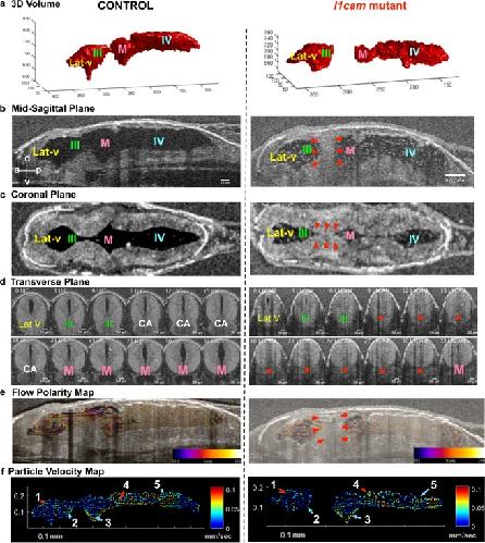Figure 3. Characterization of c21orf59 and foxj1 morphants. (a) 3D rendering of the tadpole ventricular system shows aqueductal stenosis and a smaller ventricular system in c21orf59 morphants compared to controls and (b,c) flow polarity and particle velocity maps confirm loss of FFs 1-4 as well as diminished flow in FF5. (d) 3D rendering of the tadpole ventricular system shows ventriculomegaly in foxj1 morphants and (e,f) flow polarity and particle velocity map confirm loss of FFs1-4 and slow FF5. (Lat-V: lateral ventricle, III: 3rd ventricle, M: Midbrain ventricle, IV: 4th ventricle). |