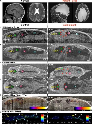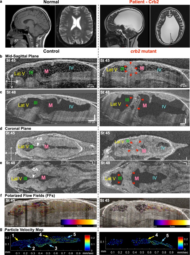 Figure 5. Hydrocephaly phenotype with CRB2 mutations. (a) CT scan of a normal brain and patient brain, with enlargement of the brain ventricles. (b) Mid-sagittal view (d) Coronal view using OCT shows reduction in ventricular size along with CA stenosis in crb2 F0 CRISPR mutant tadpole brain at stage 45 as compared to controls. (c) Mid-sagittal view (e) Coronal view of control and crb2 F0 CRISPR mutant tadpole raised to stage 48 shows enlargement of the ventricles as compared to controls. This result was seen in 3 animals that survived to this later stage. (White arrow head â CA, red arrowheads â stenosis of CA). (f) Stage 45 tadpole particle tracking shows the impairment of the flow fields in the lateral 3rd and midbrain ventricles, but normal flow in the fourth ventricle for the crb2 F0 CRISPR mutant as compared to the control. (g) 2D Particle Velocity Map shows loss of FFs 1-3 and intact FFs 4-5. (Lat-V: lateral ventricle, III: 3rd ventricle, M: Midbrain ventricle, IV: 4th ventricle). |