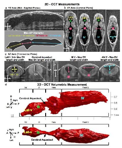 Supplemental Figure 1. Measurements by OCT of the Xenopus tadpole ventricular system. (a) Mid-sagittal view (YZ axis): The dorsal-ventral (DV) plane along the anterior-posterior (AP) axis of the ventricular system. The AP length measurement positions are shown for the lateral ventricle and 3rd ventricle in yellow, midbrain ventricle in purple and 4th in blue. (b) Coronal view (XY axis): The top view of the ventricular system is visualized using the 3D acquisition. The width of each ventricle can be measured in this view along with the CA width. (c) Transverse view (XZ axis): DV height and Left-Right (LR) width for each of the ventricle is shown when moving from anterior to the posterior of the animal. The Lateral and 3rd ventricle is shown at its widest and deepest section followed by the height and width of the Cerebral Aqueduct (CA). The midbrain ventricle is deepest anteriorly and becomes wider as it merges into the 4th ventricle which is shown as the last image. (d) 3D rendering of the ventricular system presented on sagittal and coronal plane. |