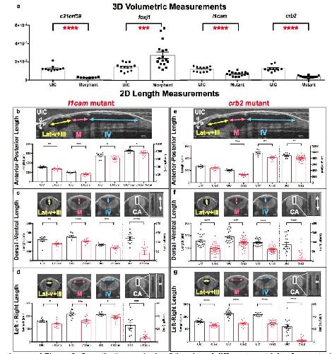 Supplemental Figure 3. Quantitative analysis of the size of different ventricles for control and mutant frogs using OCT. (a) Comparison of 3D volumetric measurements for the ventricular system for c21orf59 and foxj1 morphants and l1cam and crb2 F0 CRISPR mutants with their respective controls. (n=10-20). Schematic representation of position of 2D measurements taken on the control vs. l1cam (left column) and crb2 (right column) F0 CRISPR mutant ventricles are shown at the start of each panel. (b, e) Anterior-posterior length measurements: Mutants show reduced length for individual ventricles as well as of the entire ventricular system. (c, f) Dorsal-ventral height measurements for each ventricle and CA. (d, g) Left-right width for each individual ventricle and the CA. (Total: Total ventricular system length from the most anterior tip of the lateral ventricle to the most posterior tip of the 4th ventricle. *P<0.05, **p<0.01, ***p<0.001, ****p<0.0001. Bars indicate the mean value and each individual data point is shown (n=10-40).) |