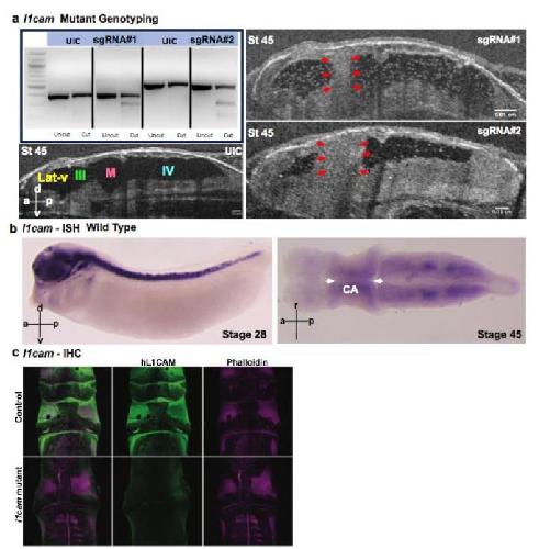Supplemental Figure 4. Validation of l1cam F0 CRISPR mutant. (a) DNA gel showing the PCR product for each l1cam F0 CRISPR mutant and control, before and after cutting with T7 endonuclease I. Mid sagittal OCT image of control and two independent l1cam F0 CRISPR mutants, the later showing stenosis of the cerebral aqueduct (red arrowheads). (b) At stage 28 l1cam mRNA expression can be seen in the eye, brain, spinal cord and the notochord using in-situ hybridization. At stage 45 it is weakly expressed in forebrain but a strong expression is seen in the mid and hind brain region. (c) Immuno-fluorescence against l1cam protein shows loss of the signal in mutant as compared to the control stage 45 brain. |
