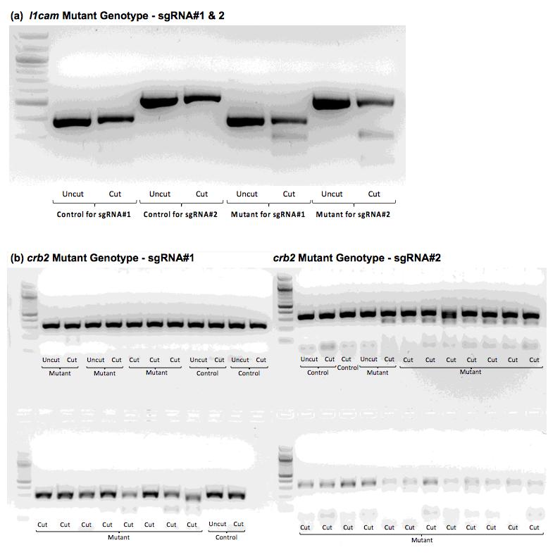 Supplemental Figure 6 (a) Full - DNA gel showing the PCR product for each l1cam F0 CRISPR mutant and control, before and after cutting with T7 endonuclease I. (b) Full - DNA gel showing the PCR product for each crb2 F0 CRISPR mutant and control, before and after cutting with T7 endonuclease I. |
